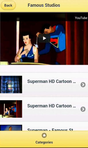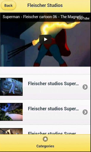 Superman Cartoon Club has the all cartoon of superman, have Famous Studios and Fleischer Studios.In my App has all episodes of superman cartoon.#######################The pilot and first eight shorts were produced by Fleischer Studios from 1941 to 1942, while the final eight were produced by Famous Studios, a successor company to Fleischer Studios, from 1942 to 1943. Superman was the final animated series initiated under Fleischer Studios, before Famous Studios officially took over production in May 1942.Although all entries are in the public domain, ancillary rights such as merchandising contract rights, as well as the original 35mm master elements, are owned today by Warner Bros. Animation. Warner has owned Superman publisher DC Comics since 1969.source: en.wikipedia.org/wiki/Superman#####################Fleischer Studios- Superman - The Mechanical Monsters- Billion Dollar Limited- The Arctic GiantFebruary - The Bulleteers- The Magnetic Telescope- Electric Earthquake- Volcano- Terror on the MidwayFamous Studios- Japoteurs- ShowdownOctober - Eleventh Hour- Destruction- The Mummy Strikes- Jungle drums - The Underground World- secret Agents all of these cartoons are now in the public domain, free downloadable.DISCLAIMER : None of the content in this app was created or modified by us. We are a curator providing direct access to content publicly available on youtube The content of this app is powered by YouTube. We are not responsible for any copyright issues as the app gives access to YouTube videos as is. We did not upload any of the videos to YouTube.
