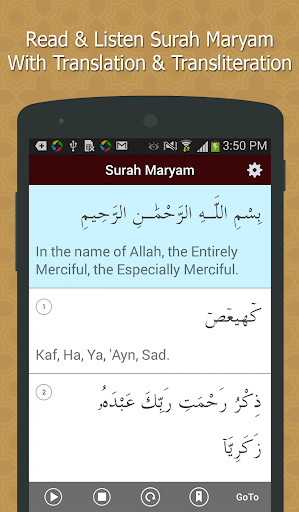 • Aplikasi menyediakan transliterasi Surah penuh. Maryam untuk membantu dalam pengucapan bahasa Arab yang benar. Nomor Ayat di bidang pencarian.