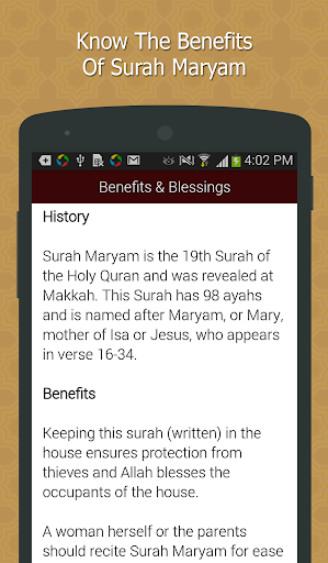 Surah Maryam akan membantu Anda membaca Surah kapan saja Anda inginkan di ponsel Anda. Ada kebajikan tak terbatas yang dianggap berasal dari pembacaan Surah Al Maryam. Apalagi, aplikasi ini akan sangat meningkatkan kemampuan bacaan Anda melalui transliterasi dan pembacaan yang jelas.