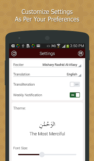 • Aplikasi ini menyediakan opsi pemilihan tema dengan membiarkan pengguna memilih ukuran teks, warna teks dan warna latar belakang.