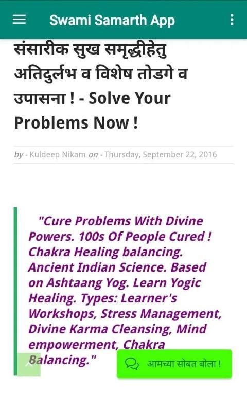 Navnath mantra, Gurucharitra, Datta Upasana, Namsmaran, Devhara, Swami Samarth Upasana, Dhyan, Pitrudosh, Chakra Sadhana. Cure Problems With Divine Powers. 100s Of People Cured ! Chakra Healing balancing. Ancient Indian Science. Based on Ashtaang Yog. Learn Yogic Healing. Types: Learner's Workshops, Stress Management, Divine Karma Cleansing, Mind empowerment, Chakra Balancing.