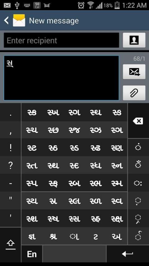 ઽ, ઑ, ૃ, ઋ, ૄ, ૠ, ત્ર, ૅ, ૉ ). Angka, simbol dan karakter jarang digunakan muncul pada pergeseran. Anda juga bisa beralih ke keypad QWERTY sementara untuk memasukkan karakter bahasa Inggris.