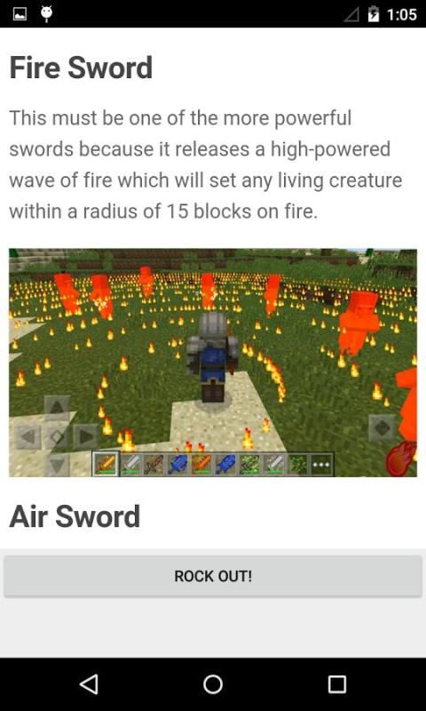"Sword Mod Installer" adds the top sword mods to download folder in your android device. Sword Mod minecrafe pe is an awesome minecraft pe mod that adds eight new swords and each of them got a unique power which is somehow connected to its element. One of the swords will cause something like a tornado which will make any nearby enemies to be thrown up into the sky and then die. Another sword will make the nearby mob be launched up into the sky like a rocket but in this case it will also be set on fire. There are a wide range of different abilities and the best way to experience them is to download the mod and see for yourself.