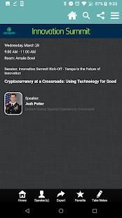 The Synapse 2018 Summit Inovasi aplikasi mobile memungkinkan Anda untuk melihat jadwal, presentasi, peserta pameran dan rincian pembicara dari konferensi. Pengguna dapat mengambil catatan slide presentasi yang berdekatan tersedia dan menggambar langsung pada slide dalam aplikasi. Catatan-taking juga tersedia dalam poster dan pameran modul.