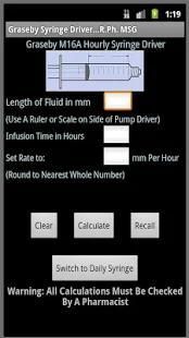 Aplikasi gratis ini akan menghitung tingkat pengaturan di mm per jam atau mm per hari untuk Driver Graseby Syringe berdasarkan cairan panjang dan infus waktu.