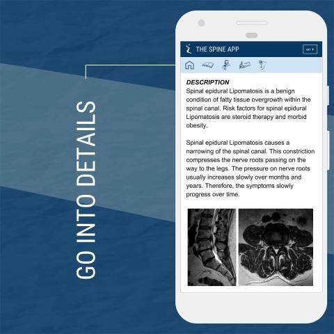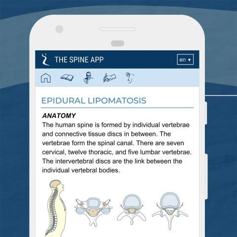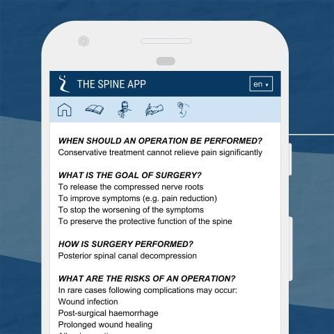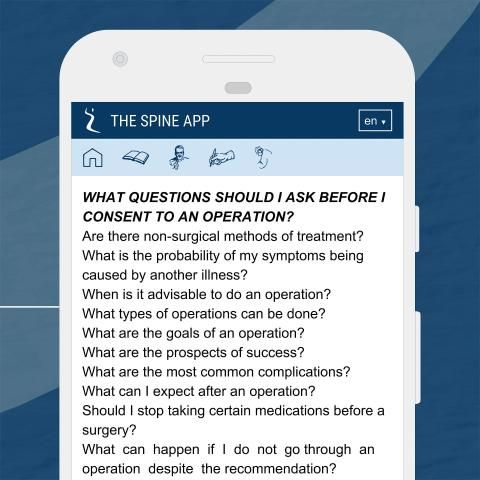THE SPINE APP adalah aplikasi multibahasa yang dirancang untuk membantu pasien dari seluruh dunia untuk mendapatkan informasi mendalam tentang penyakit tulang belakang termasuk penyebabnya, kemungkinan perawatan dan protokol untuk pengambilan keputusan mengenai operasi. Aplikasi Spine dapat digunakan untuk mempersiapkan janji dokter atau untuk membantu memahami rekomendasi dokter. THE SPINE APP sekarang tersedia dalam bahasa Inggris, Jerman, Rusia, dan Bulgaria. Lebih banyak bahasa akan segera menyusul.