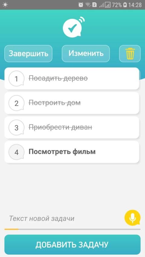 Приложение поможет вам управлять задачами, которые необходимо выполнить в течении дня или в ближайшем будущем. С помощью данного TO-DO менеджера вы можете совершать следующие действия: добавлять задачи (в том числе с помощью голосового ввода), перемещать их по списку (drag & drop), переименовывать, удалять, помечать как выполненные, устанавливать фильтры. Любые ваши замечания или предложения приветствуются.