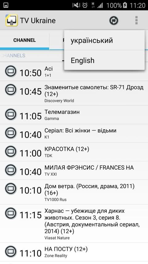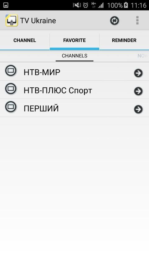 Program for viewing TV programs include a lot of Ukrainian and Russian TV channels. You can view the daily program of each channel, add your favorite channels to favorites, and you can set a reminder for each channel separately, so as not to miss your favorite TV shows, TV series, the movie. Reminder is triggered by a notification 5 minutes before the start of the program. Application does not have neither a television broadcasting, and is intended solely for viewing the TV Ukrainski and Russian channels.