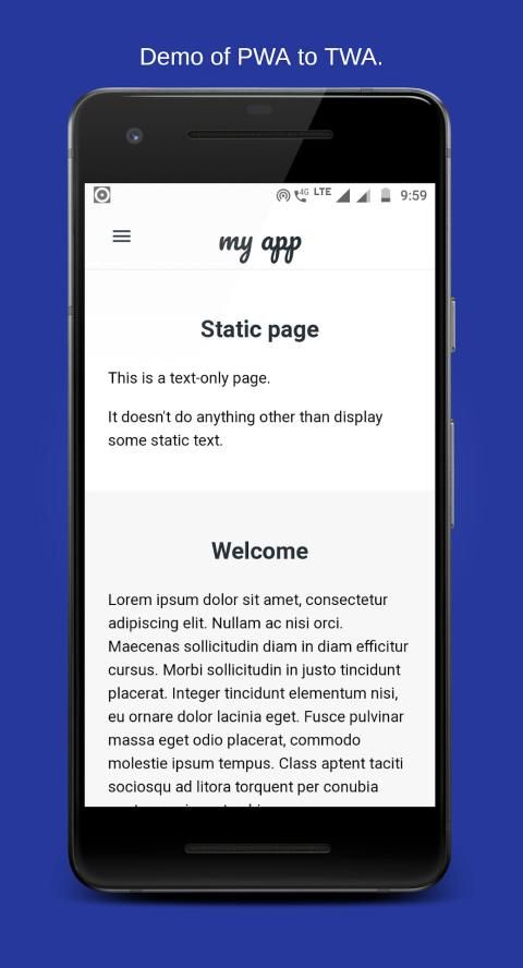 This is simple app that is specially developed for the developers. This app demonstrate the use of TWA (Trusted Web Activities) in Android. This app is built based on the standards of Trusted Web Activities and can helpful for other developers to test and check how TWA apps are look and fill on actual device.