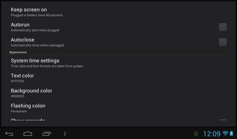 You can use this application for your lovely device like screen saver while charging. Especially for devices with dock stations. Just turn on autorun and autoclose feature in settings and clock will appear while device is docking.