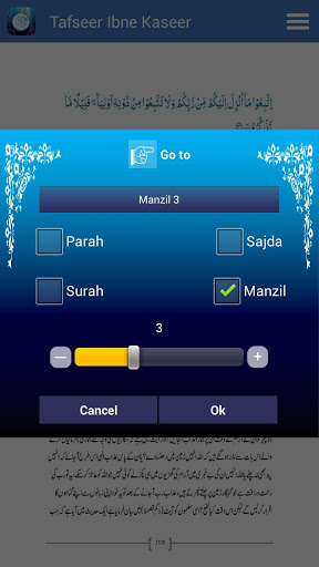 * Advanced navigation using Go to page number, Parah , Surah, Manzil and Sajda index helps to navigate easily.