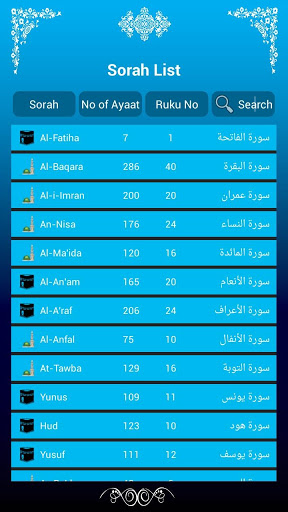 * Search functionality for surah names in English.