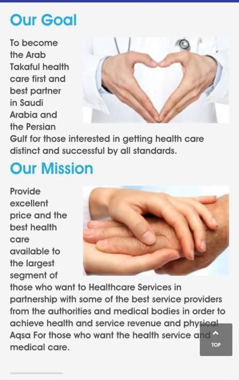 Takaful Alarabia: Sebuah perusahaan profesional yang bergerak di bidang penyediaan layanan medis dan badan perawatan kesehatan dan perusahaan publik dan swasta, serikat pekerja dan koperasi, badan amal dan individu di semua segmen masyarakat untuk memastikan dan memberikan tingkat layanan yang sangat baik kepada anggota. dari badan-badan ini dan keluarga mereka. Program perawatan kesehatan, yang ditawarkan oleh perawatan kesehatan Takaful Arab salah satu program paling penting bagi para pekerja di bidang ini.