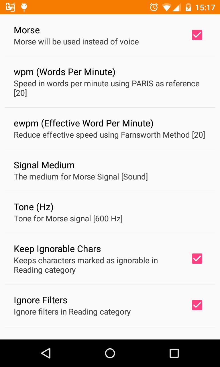 -Morse Code by sound (400Hz - 1000Hz) or vibration.