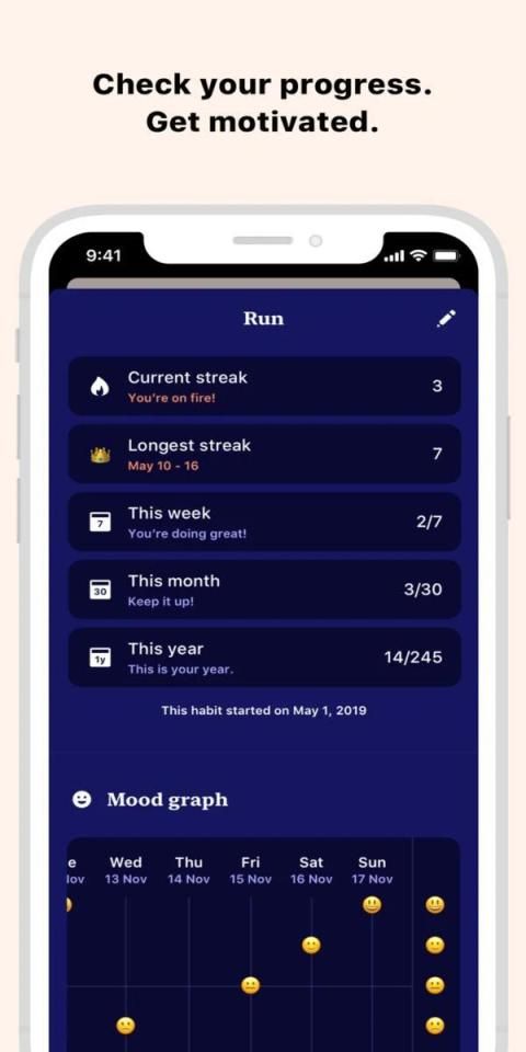 Check your current streaks, goals, notes and completion history/rate for every habit you track. Get an overview of how you are performing and motivate yourself to achieve even more. One day at a time.