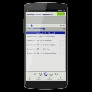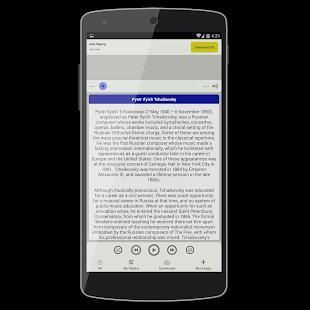Dalam aplikasi ini Android Anda akan streaming musik klasik online, sehingga Anda akan perlu memiliki akses Internet, kami sarankan WiFi bila memungkinkan. Namun, ada pilihan untuk men-download musik klasik gratis untuk android Anda, cara ini Anda dapat mendengarkan musik klasik dari aplikasi ini bahkan ketika Anda tidak memiliki akses Internet.