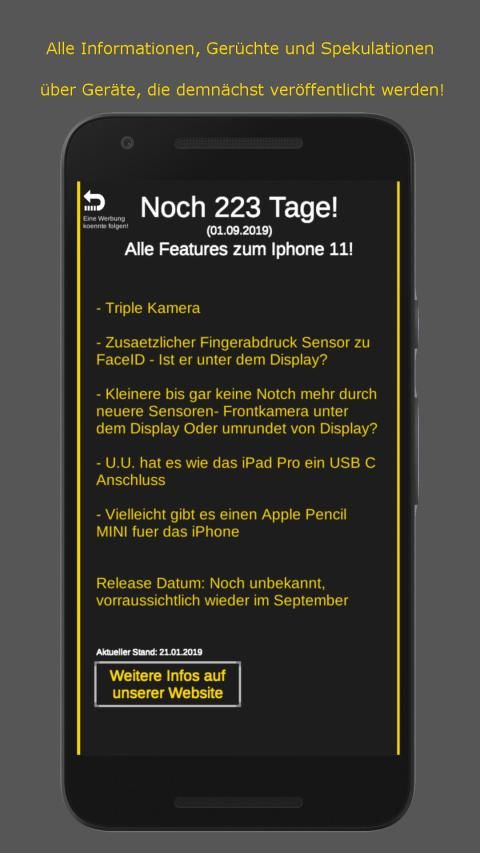 In unserer App „Tech Release“ werden alle Infos rund um Smartphones, Tablets, Laptops, PCs, etc., die in naher Zukunft veröffentlicht werden (wie iPhone 11, OnePlus 7, Huawei P30, Google Pixel 4, etc.), angezeigt. Dies verleiht euch einen guten Überblick über die aktuellen Neuheiten/Innovationen, aber auch über die Gerüchteküche über neue Geräte. Unser Ziel ist es, euch die Smartphones, Tablets, Laptops, PCs, etc. die noch nicht zu kaufen sind, mit unseren Infos die wir von verschiedenen Seite herausziehen, näher zu bringen und euch auf das „Release-Event“ der jeweiligen Geräte vorzubereiten.