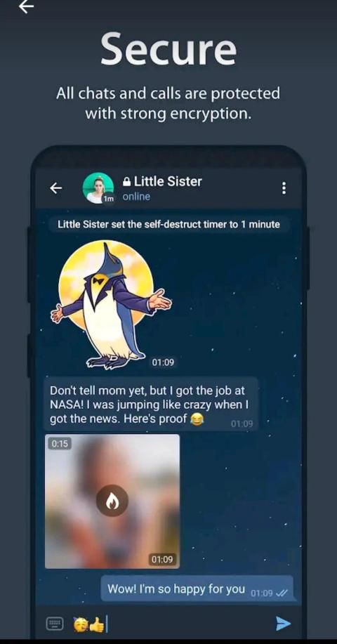AMAN: Kami menjadikannya sebagai misi kami untuk memberikan keamanan terbaik yang dikombinasikan dengan kemudahan penggunaan. Semua yang ada di Telegram, termasuk obrolan, grup, media, dll. Dienkripsi menggunakan kombinasi enkripsi AES 256-bit simetris, enkripsi RSA 2048-bit, dan pertukaran kunci aman Diffie-Hellman.
