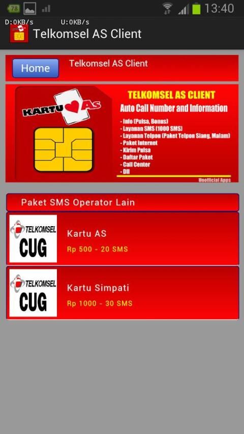 Aplikasi Telkomsel AS Client adalah sebuah aplikasi android yang memudahkan pengguna provider jarigan seluler Telkomsel Kartu AS dalam menikmati layanan (Unofficial Aplikasi Telkomsel).