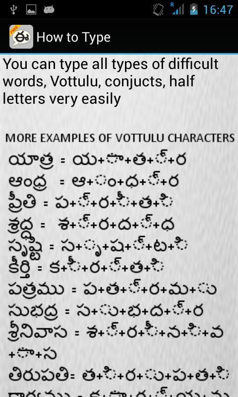 Ikuti contoh-contoh ini, setelah beberapa waktu Anda akan digunakan untuk Telugu Keyboard statis IME untuk Telugu mengetik.