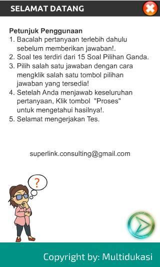 Soal tes terdiri atas 15 soal pilihan ganda. Jujurlah dalam menjawab soalnya