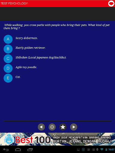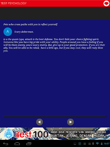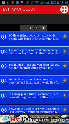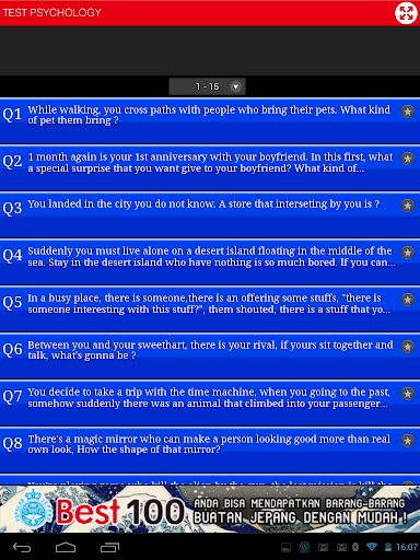 Dengan menjawab pertanyaan berdasrkan adegan/situasi yang dijelaskan dalam aplikasi ini, kita dapat dengan mudah mendiagnosa hal-hal mendalam yang biasanya tak terlihat. Nikmatilah aplikasi ini sebagai hiburan yang menarik untukmu.