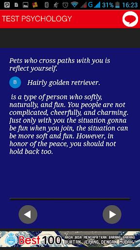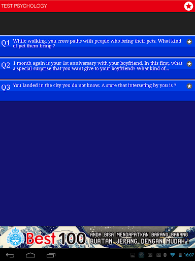 * Kamu dapat menikmati aplikasi ini secara gratis. Kamu mungkin saja bisa menemukan sesuatu yang mengejutkan yang selama ini tidak kamu ketahui, jika kamu menyuruh teman atau pacarmu untuk menjawab pertanyaan-pertanyaan yang ada di dalam tes ini. Karena ini adalah tes psikologi sederhana yang dapat dijawab dengan intuisi.