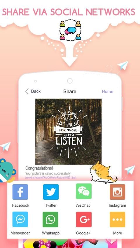 lets you easily add cool Texts, Quotes, Captions and Stickers to your photos. And share it with your friends in the world via Instagram, Facebook, Twitter etc or instant messaging applications. Wow...your design will get more "like" and "followers" from your all friends in the world!