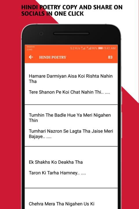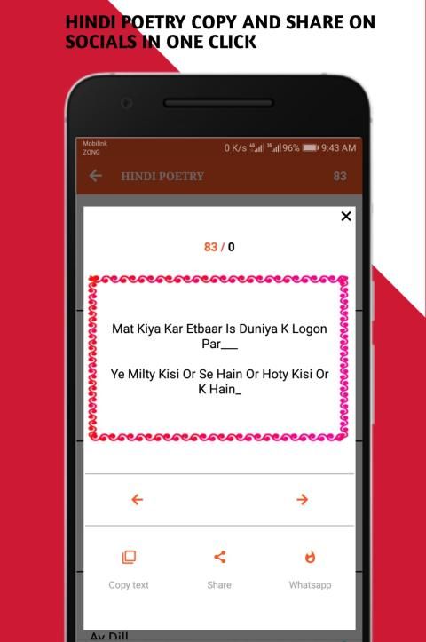 Aplikasi ini dibangun untuk pecinta SMS yang ingin berbagi perasaan dengan teman dan seseorang yang spesial, dalam aplikasi ini pengguna dapat menemukan SMS teks berbahasa Urdu, Hindi, dan Inggris untuk dibagikan kepada teman.