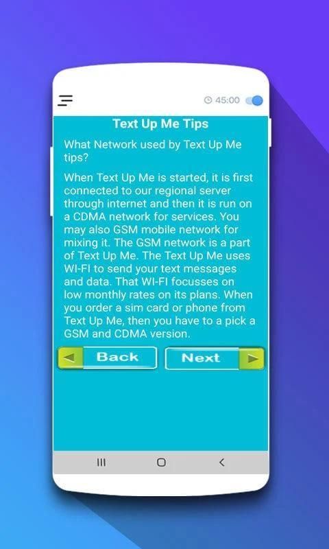 Text Up Me Tips is a free android guide app for sending sms to other numbers. This app give you tips to find different numbers of different countries which makes you able to text these countries free with any number of your choice. Unlimited Text to USA, Canada, UK and Australia: enjoy as many as you want free SMS, so free text now.