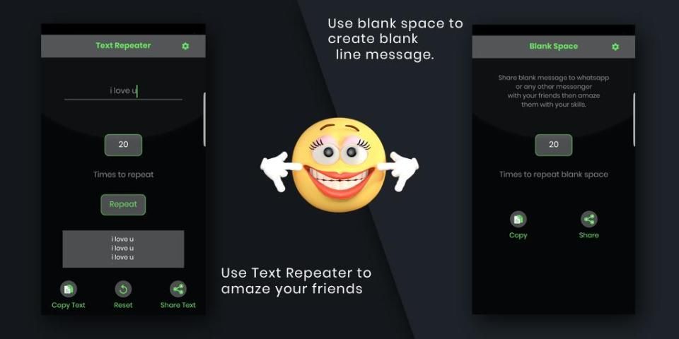 - Jika Anda ingin mengetik beberapa kali pesan atau sentance seperti "I love you" 100 kali, dengan aplikasi ini Anda dapat langsung menulis "I love you" pesan 100 kali. Hanya menuliskan pesan kali, mengatur tingkat repeat (100 misalnya.) Dan mendapatkan pesan siap langsung.