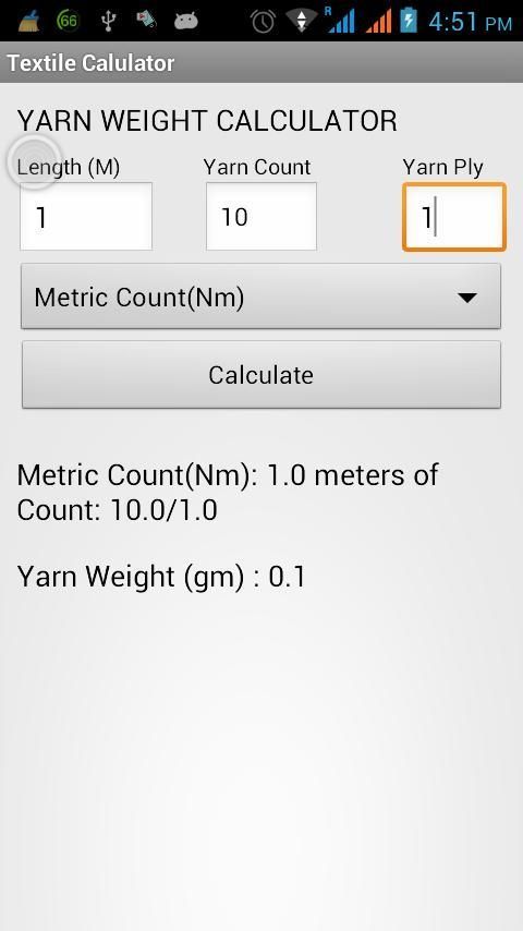 Benang Kalkulator: Membantu Anda untuk Menemukan hitungan berbagai benang dengan mengambil Berat, Panjang dan berkepribadian benang.