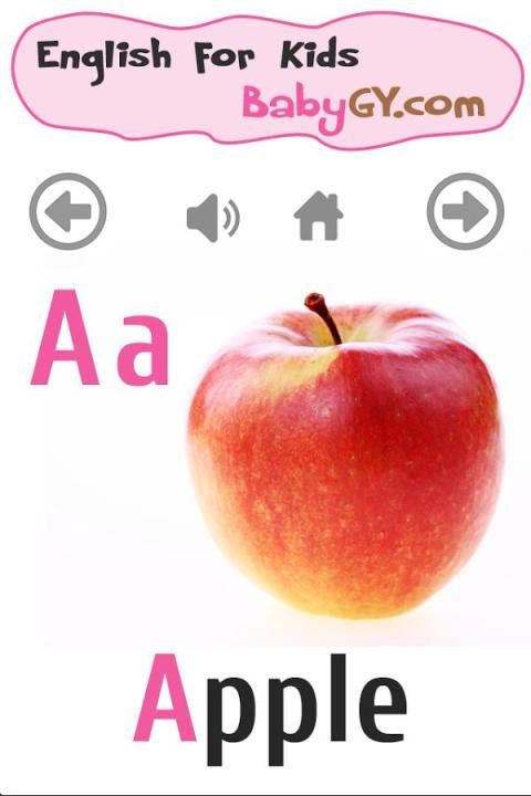 26 kartu untuk mempelajari huruf-huruf alfabet dan nama-nama buah dalam bahasa Inggris. Aplikasi ini cocok untuk studi bahasa Inggris dengan anak.
