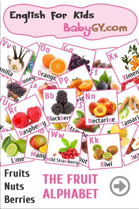 Aplikasi untuk belajar abjad Inggris dengan anak-anak. 26 kartu flash, masing-masing kartu: surat, nama buah dan fotografi. Dengan aplikasi ini anak Anda akan mengingat semua huruf abjad bahasa Inggris, nama dan ejaan huruf bahasa Inggris. Anak itu belajar kata-kata baru dalam bahasa Inggris, dan itu ia bisa mempelajari nama 26 buah dalam bahasa Inggris.