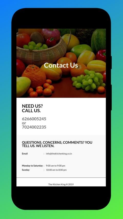 Kenyamanan di ujung jari Anda: Berbelanja online di aplikasi The Kitchen King untuk mendapatkan sayuran pertanian segar, buah-buahan, & produk susu tepat di depan pintu Anda. Sekarang Anda tidak perlu lagi membawa tas belanjaan besar!