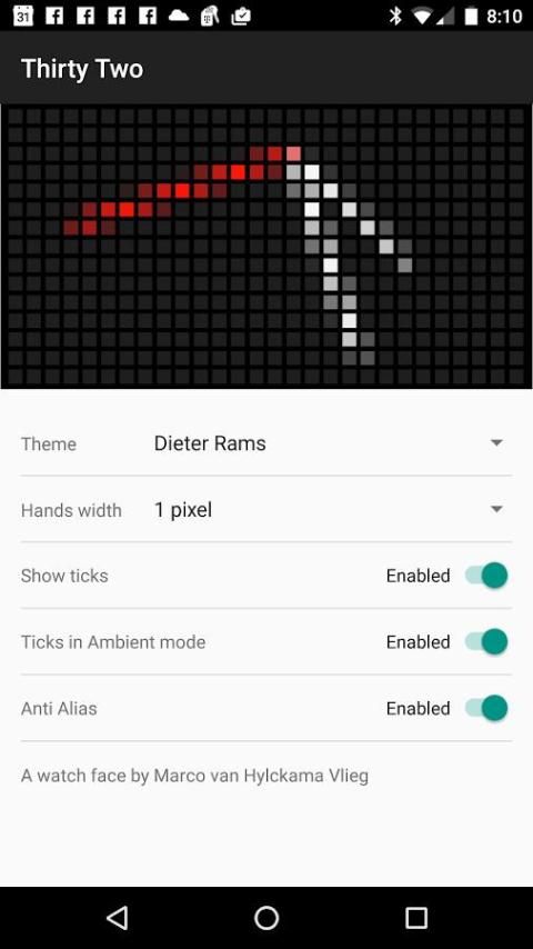 Tiga puluh Dua membawa benar rasa retro untuk Wear menonton Android Anda. Memamerkan jam tangan cerdas dalam fantastis kemuliaan 32x32 pixel. Wajah menonton ini mensimulasikan berbagai klasik LED dan LCD dot matrix display.