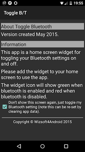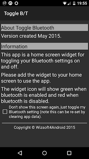 Added option at customer request to allow the app to toggle the bluetooth setting as per a previous version (achieved by selecting the "don't show this screen again, just toggle my bluetooth" checkbox on the app screen).