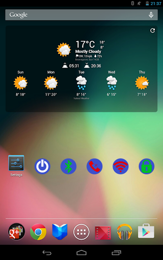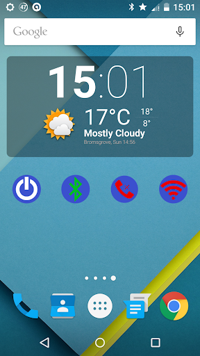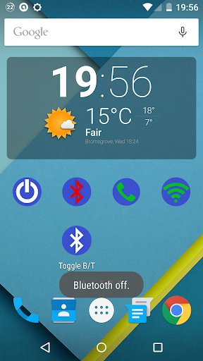 Put the widget on your home screen and tap it to toggle your Bluetooth setting. The widget indicates the current Bluetooth setting by the colour of the Bluetooth icon as follows: