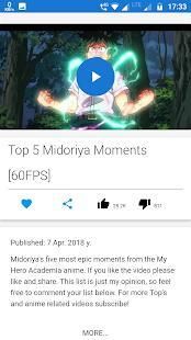 I this application you will see Top 10 Action, Romance, SuperPower, Fights...etc. There are lots of videos you will love it.Find Anime related videos which includes Top 10's, Fights, epic moments and more all in 60FPS!