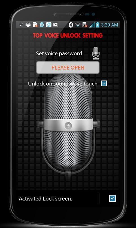 This application unlock your android phone with voice code. This app is customizable Top Voice lock screen This is a beautiful top voice lock screen for android devices. With the help of this app you can unlock your smartphone with voice code. This lock also has alternative unlocking method. When you enable this option then you just have to click on wave animation for unlocking your smartphone using top voice screen lock.