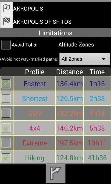 • online routing Yunani. Pilihan meliputi tercepat & terpendek rute, zona ketinggian, penghindaran tol.