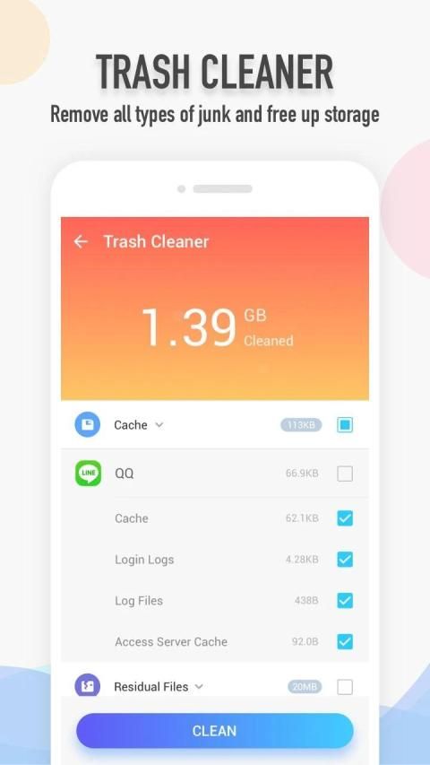 This cache and junk file cleaner has intelligently and accurately analyzed thousands of apps and how junk file created. Therefore it can clean junk file and other residual file to reclaim storage space.