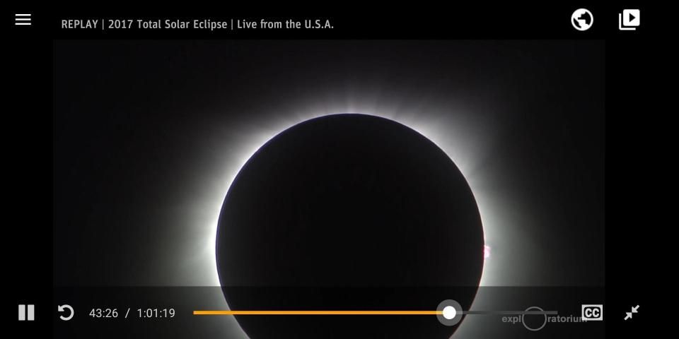 This free app allows you to view three simultaneous video streams: 1) LIVE coverage hosted by Exploratorium educators and NASA scientists, 2) LIVE coverage in Spanish hosted by Exploratorium educators, and 3) a non-narrated, two and a half hour live telescope view of the full eclipse.