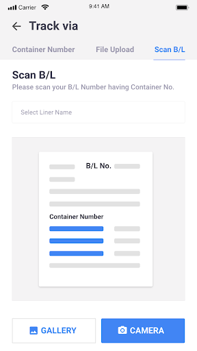 3. Untuk melacak wadah dengan mengambil foto atau mengunggah foto B / L atau dokumen pengiriman lainnya yang memiliki nomor wadah pada mereka, gunakan opsi 'pindai b / l' dari tab