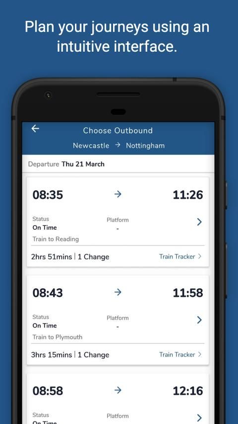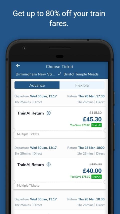 TrainAI mencari melalui semua tarif National Rail secara otomatis untuk mengetahui kombinasi tiket termurah untuk perjalanan Anda yang akan menghemat uang. Anda kemudian dapat membeli tiket ini dengan satu sentuhan tombol.