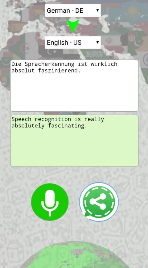 Speak into the microphone and the "Translator for Whatsapp" writes the text in the desired language. Both the translation of the spoken language and the translated text are displayed directly. So you can check whether the speech recognition has worked properly. Then simply send the translated text to any Whatsapp contact via the "WhatsApp Share" button.