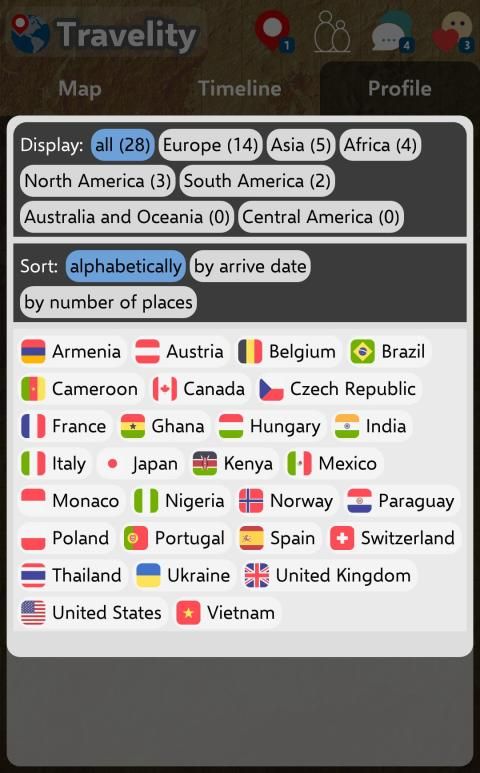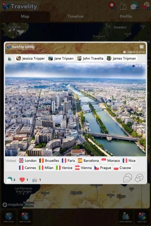 In Travelity, you will create a unique album composed of your travels. Put your favorite trips on the map, add photos to them. Take a look at statistics about your visited places and countries!