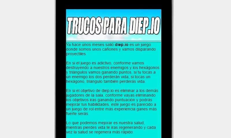 Sebuah aplikasi lengkap pada permainan diep.io tahu trik yang akan membawa Anda untuk menjadi yang terbaik dalam permainan, kami juga telah membuat koleksi senjata yang berbeda diep.io dalam aplikasi kita juga akan belajar hal-hal dasar permainan yang sama, adalah diep.io adalah melakukan sangat populer Anda pasti akan ingin meng-upload beberapa gameplay ke saluran youtube Anda, menerima kunjungan langsung yakin, men-download aplikasi dan tahu trik terbaik untuk diep.io yang akan membawa Anda ke dalam kemuliaan.