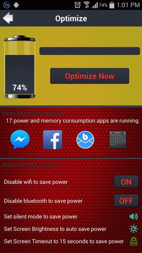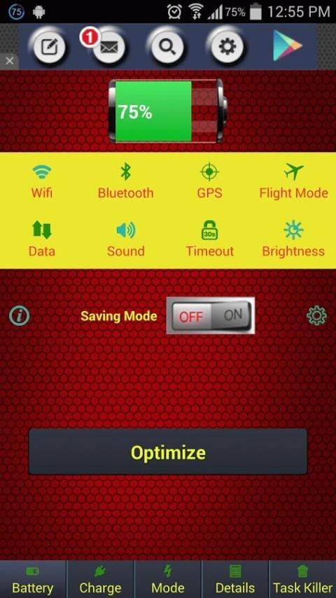 - Optimize the energy system by switching off WIFi, bluetooth, GPS, decrease screen brightness and more.