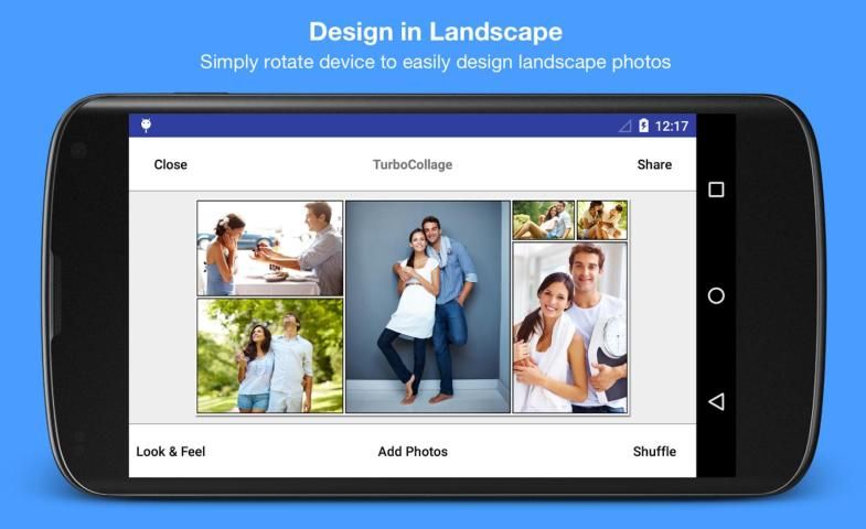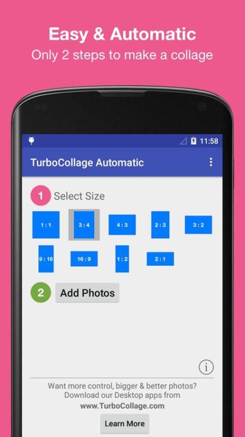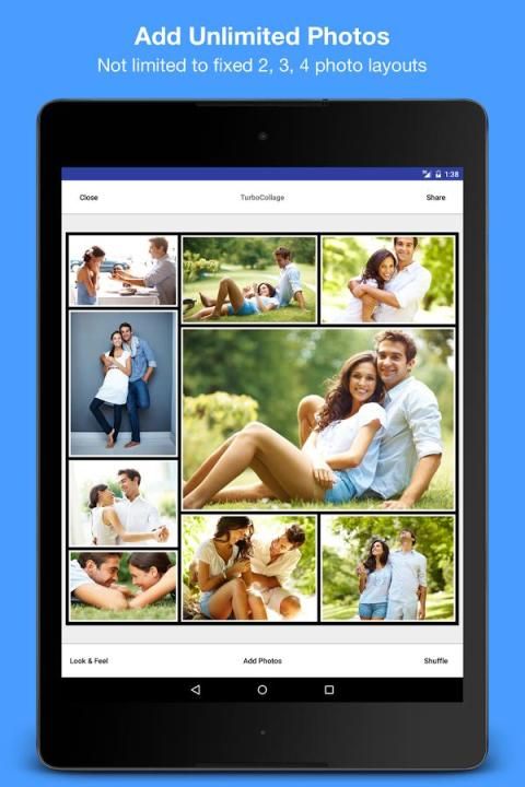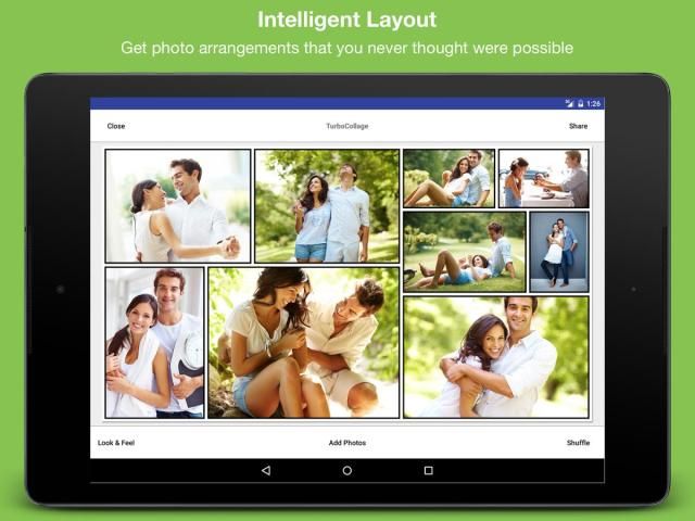 Dibangun dengan fokus pada kemudahan penggunaan, TurboCollage memungkinkan Anda menggabungkan foto menjadi kolase indah di 2 langkah sederhana - pilih ukuran & pilih foto untuk digunakan. Dengan TurboCollage, Anda tidak terjebak dengan 2, 3, atau 4 kolase gambar yang sama dengan layout tetap. Anda dapat menggunakan gambar sebanyak yang Anda inginkan dan TurboCollage melakukan kerja keras meletakkan mereka ke kolase menakjubkan yang akan mengejutkan Anda dan teman Anda pasti.